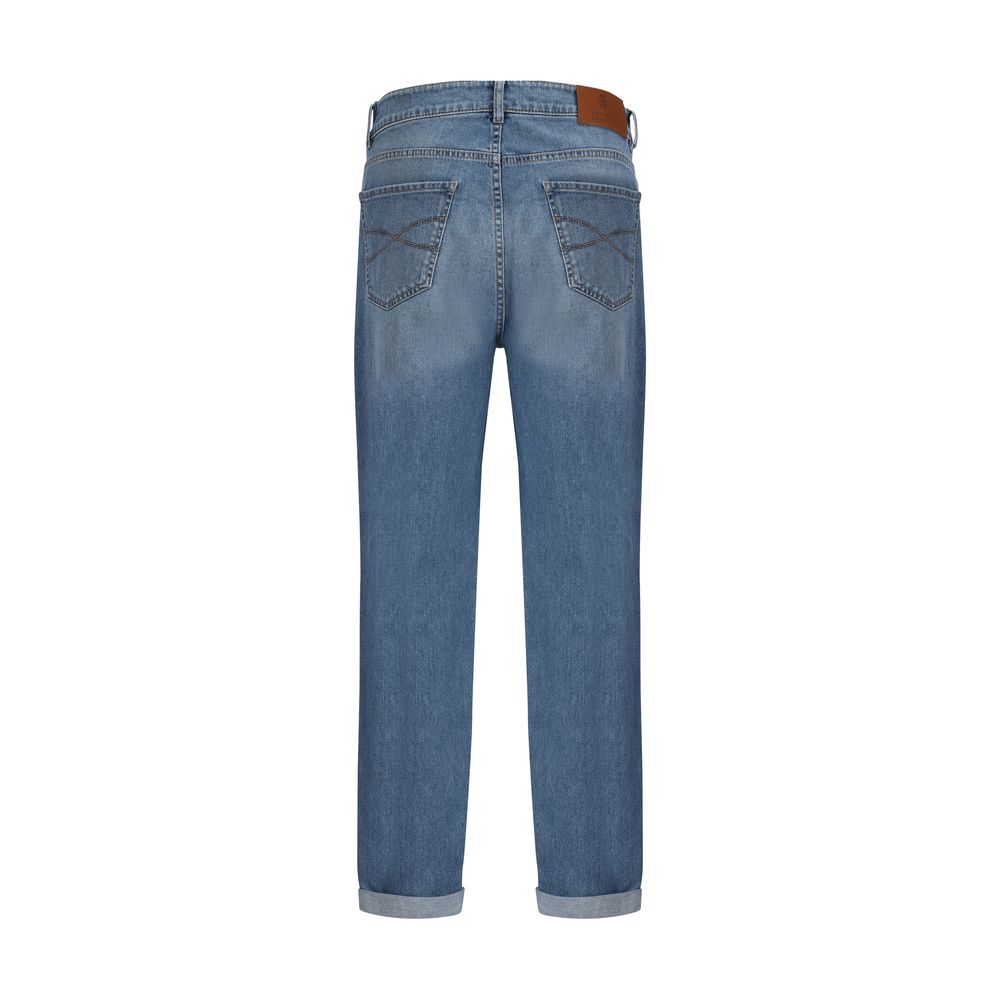 Brunello Cucinelli’s cotton jeans are a versatile and sophisticated piece, with a straight five-pocket style that offers a classic and comfortable fit. The front button closure adds a touch of elegance, while belt loops at the waistband allow you to customize the look. The iconic leather patch with the brand’s signature pressure print on the back lends a distinctive detail. The turn-up hem completes the design, adding a modern and sophisticated touch.