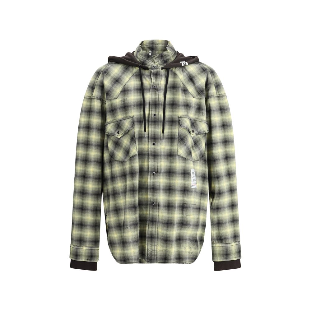 Cotton Shirt by Maison Mihara Yasuhiro with a strong character and vintage style. Model with a drawstring-adjustable hood and front snap-button closure. It features two welt flap patch pockets on the front and elastic ribbed cuffs for added comfort. The worn-effect design with check pattern and iconic monogram patch appliqué on the front lends an authentic, gritty aesthetic. The oversized fit completes the look with a contemporary streetwear touch.