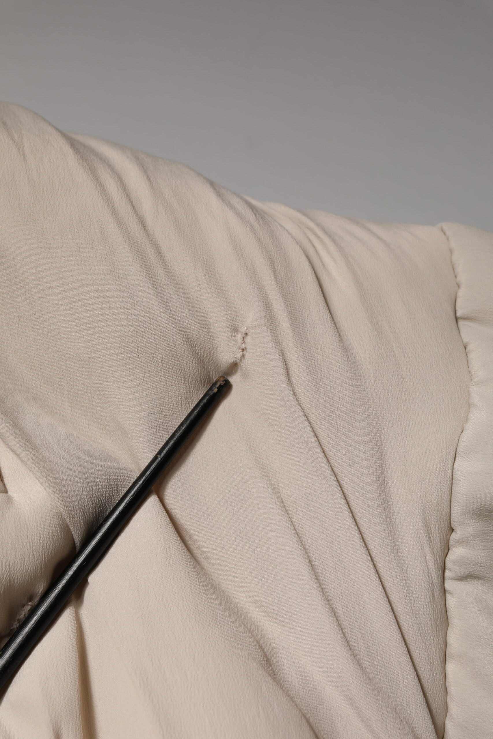 This item has a minor defect; there are pulled threads, stains and repaired holes on the front and back side and marks on the bottom part of the jacket (see pictures for details).