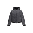 The Hooded Bomber by Represent is crafted from stretch Cotton with a peach-touch finish and a black stone-wash treatment. The design features a hood, a two-way front zip closure, four layered welt pockets on the sides, and an additional sleeve pocket. Finished with silver hardware, rib-knit trims, a cotton lining, and polyester padding, it ensures both comfort and durability. Accented with a metal initial logo at the front, this relaxed-fit bomber stands out with its contemporary character