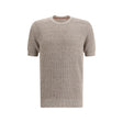 The knit T-Shirt by Brunello Cucinelli combines the lightness of linen with the comfort of cotton in a refined English half-rib knit. The design features a clean cut with a ribbed finished hem for the perfect balance of casual style and refined craftsmanship. Ideal for casual elegance in the warmer months.
