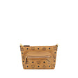Leather Aren Visetos Shoulder Bag by MCM, adjustable and removable shoulder strap, zipper closure at top, zippered patch pocket at front, iconic all-over contrasting brand logo, single interior compartment.