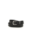The Cassandre rectangular buckle Belt in woven leather by Saint Laurent is crafted from vegetable-tanned leather, a high-quality material that stands out for its durability and natural beauty. The woven design offers a unique texture, while the rectangular buckle and silver-tone metal CASSANDRE loop add a touch of elegance. The unique feature of this belt is the absence of pre-defined holes: the pin buckle can be inserted anywhere in the weave, ensuring a perfect and customizable fit.