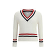 The intarsia cable-knit V-neck Sweater by Thom Browne reimagines the classic cricket pullover with a distinctive contemporary elegance. Featuring a refined cable-knit construction, it is designed with a V-neckline that enhances the silhouette. Button details add a subtle graphic accent, while ribbed cotton cuffs and hem provide a balanced and polished fit.