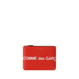Calfskin Coin Purse by Comme des Garçons, contrasting printed logo on front and back, top zipper closure, single internal compartment, brand signature printed press-stamped on front.